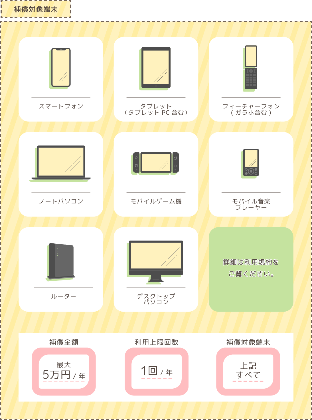 ※補償対象端末は、「機器補償」申し込み時に登録したものに限られるものとし、申し込み後は対象端末を追加することはできないものとします。
